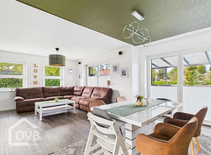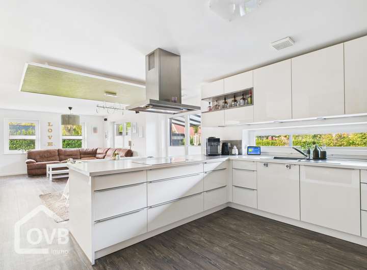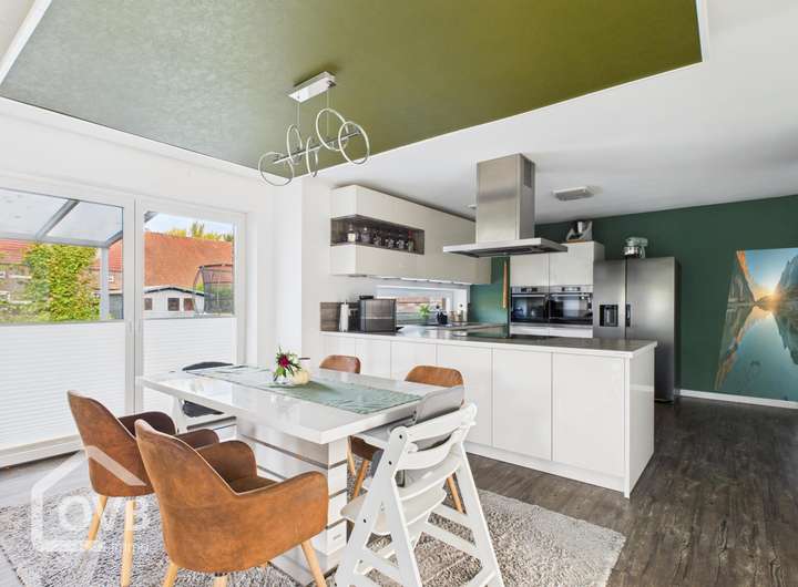 Von der Diele gelangt man in den großzügigen, lichtdurchfluteten Wohn-/ Ess-/ Kochbereich. Hier bleiben keine Wünsche offen.