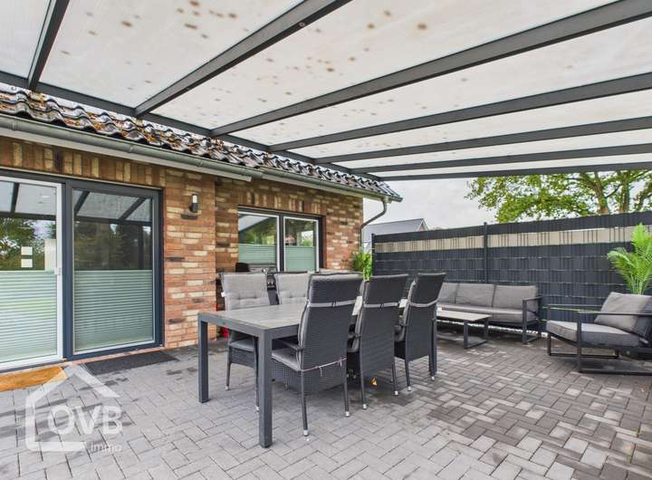 Die Terrasse ist vollständig überdacht und bietet neben viel Platz einen Sichtschutz, sowie Zugang zur beheizten Garage (aktuell als Fitnessraum genutzt). Hier steht tollen Grillabenden mit Freunden und Familie nichts im Wege! Ebenfalls zum Garten gehört ein 2025 errichtetes Gartenhaus.
