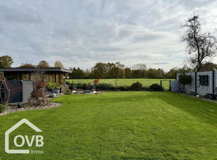 Im Außenbereich stehen neben einer Garage für einen PKW eine Werkstatt, der gepflegte und liebevoll angelegte Garten und eine überdachte Terrasse zur Verfügung. Der Ausblick über Wiesen und Felder ist ein Highlight - hier sehen Sie morgens die Sonne aufgehen und auch der Besuch von Rehen ist keine Seltenheit.