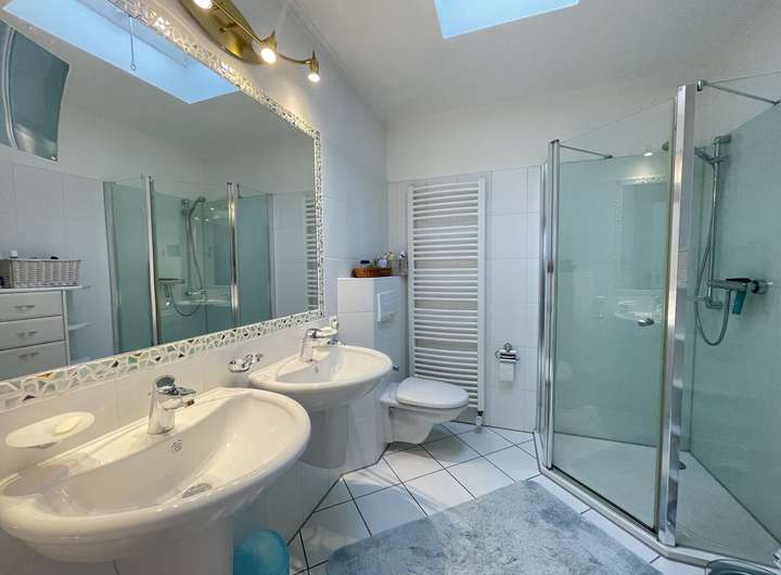 Auch insgesamt sticht die Raumaufteilung hervor. Windfang, zusätzliches Gäste-WC, Küche mit angrenzendem Hauswirtschaftsraum und kleinem Hochkeller bis hin zur großzügigen, einladenden Diele.