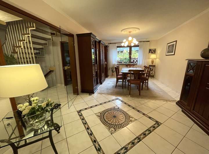 Beim Betreten des Hauses empfängt Sie eine großzügige Diele, die Sie durch eine großzügige, stilvolle Glastür in den offenen und weitläufigen Wohn- und Essbereich führt.