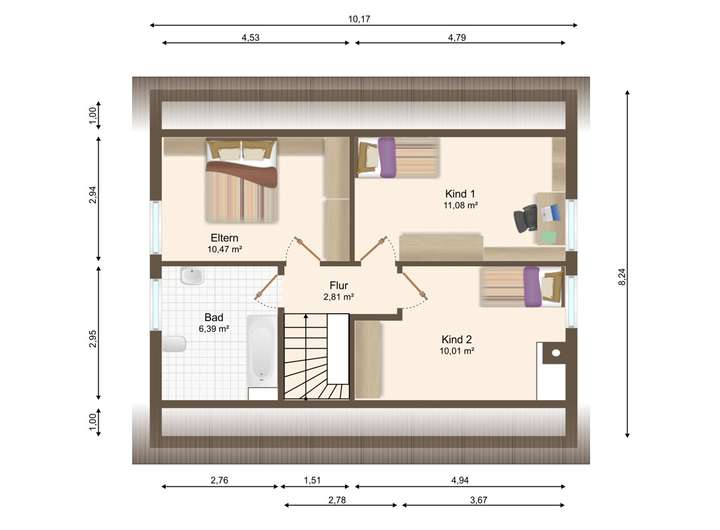 Über eine hochwertige Holztreppe, welche mit einem eleganten Stahlgeländer kombiniert ist, gelangen Sie in den oberen Bereich zum Badezimmer sowie zu den 3 Schlafräumen.