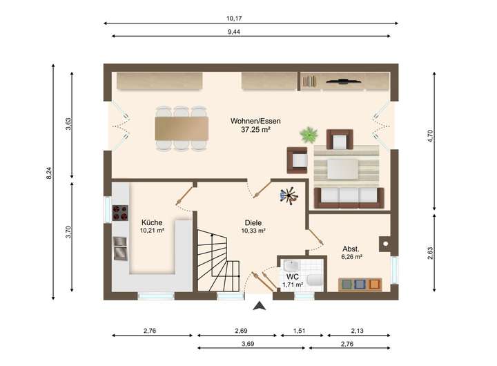 Des Weiteren finden Sie auf gleicher Ebene die Einbauküche (im Kaufpreis enthalten), das Gäste-WC sowie einen Abstellraum vor.