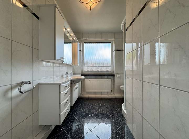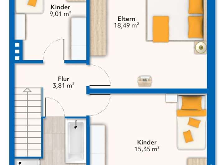 Im Obergeschoss befinden sich die drei Schlafräume und das Tageslichtbad mit Dusche und Fenster.