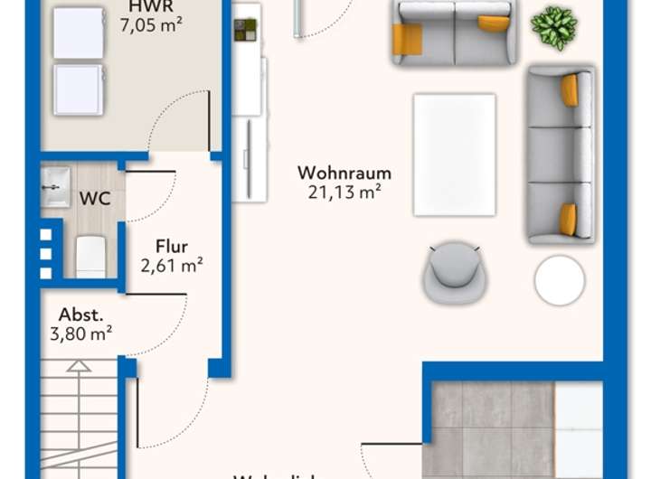 Im Erdgeschoss befinden sich der Wohn- und Essbereich mit Zugang zur Terrasse und zum Garten, die Küche sowie ein Gäste-WC. Im seitlichen, hinteren Bereich gelangen Sie zudem zum Hauswirtschaftsraum, welcher ebenfalls Zugang zur Terrasse und zum Garten bietet.