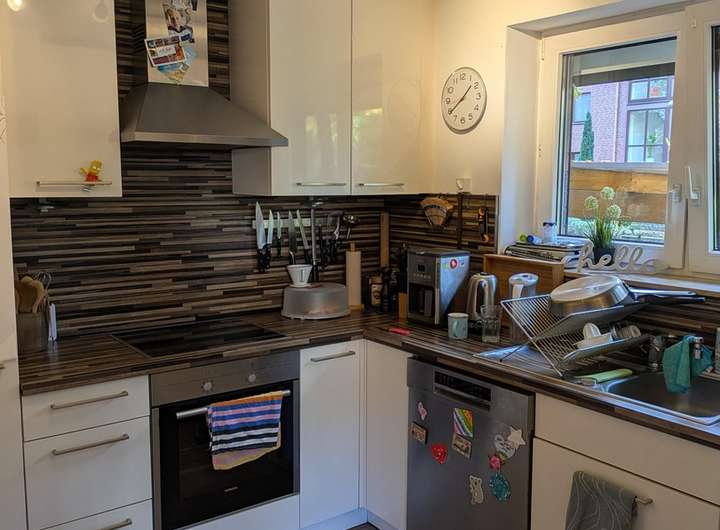 Die Einbauküche ist von 2009 und noch ein einem ziemlichen guten Zustand. Außerdem ist sie ein echtes Stauraumwunder. Lediglich Herd und Ofen müssen ersetzt werden, da schon erste technische Alterserscheinungen.