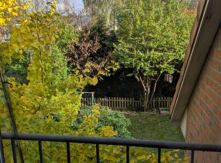 An der Front befindet sich noch ein muckeliger kleiner EG-Balkon, der dank reichlich Grünbewuchs ebenfalls kaum einsehbar ist (im Sommer).