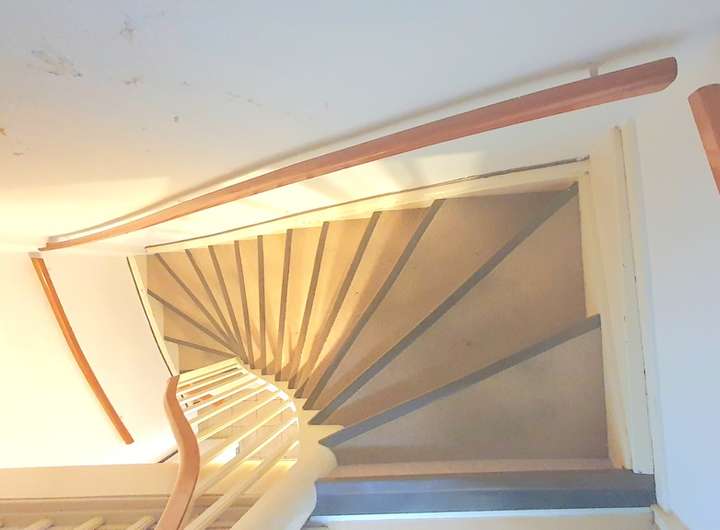Über die geschwungene Treppe erreichen sie das Obergeschoss.