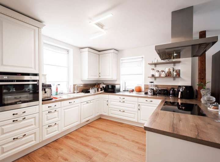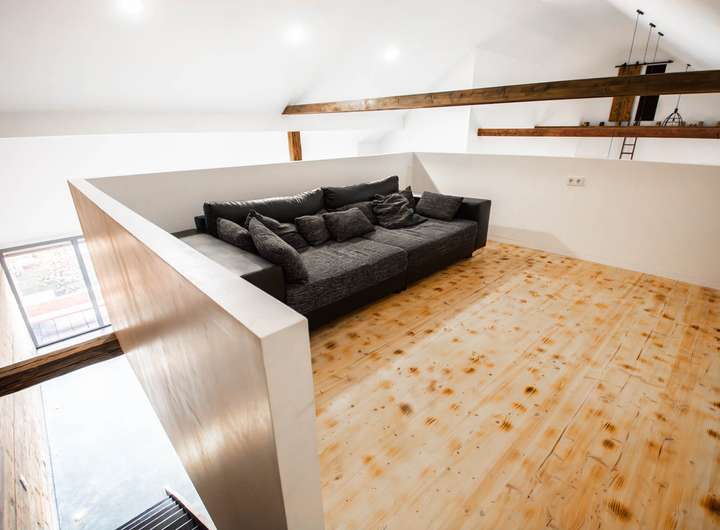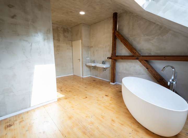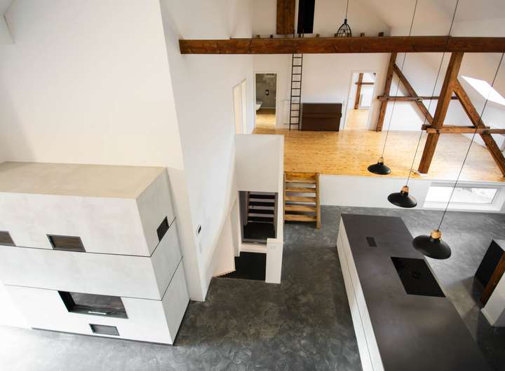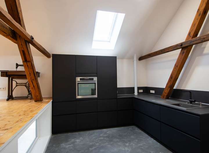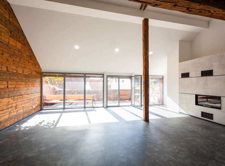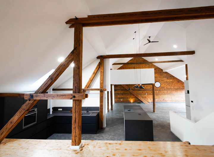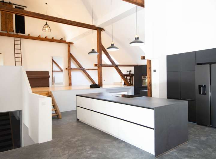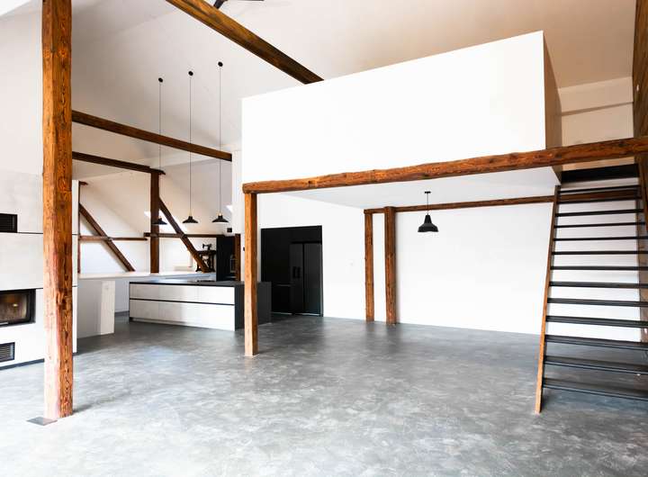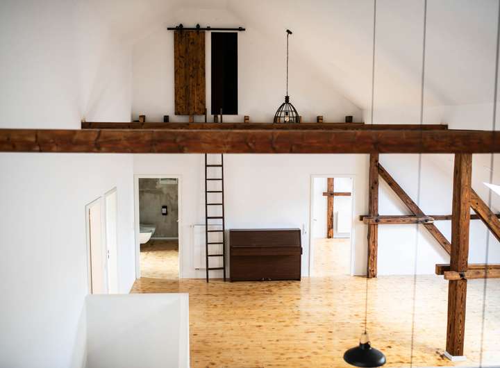 Ein absolutes Highlight ist die Loftwohnung in der ehemaligen Scheune mit ca. 250 m² Wohnfläche. Hohe Decken, großzügige Fensterflächen, sichtbare Holzbalken und offene Wohnbereiche verleihen ihr einen ganz besonderen Charakter. Auch in der Loftwohnung ist eine hochwertige Einbauküche integriert.