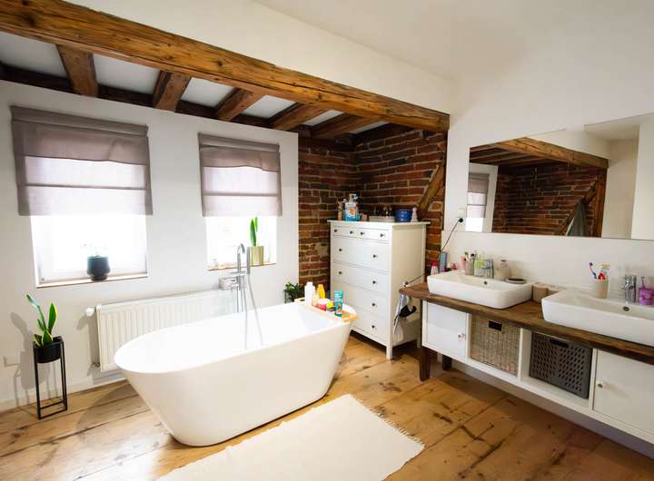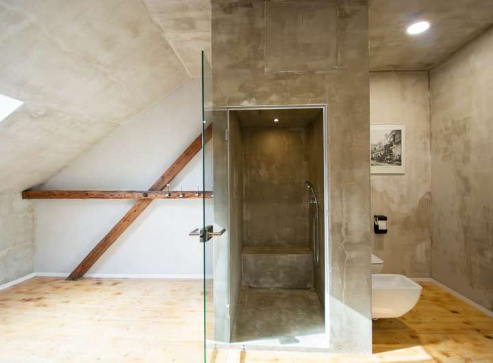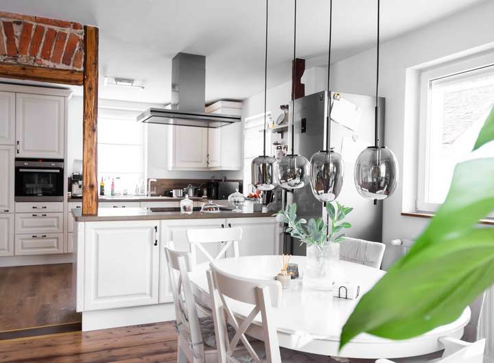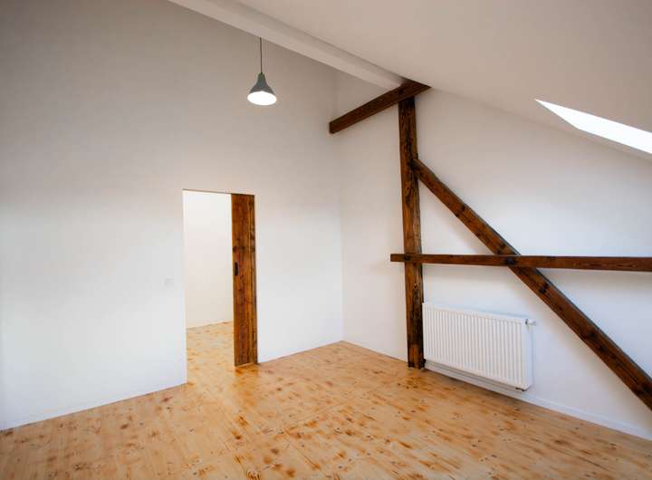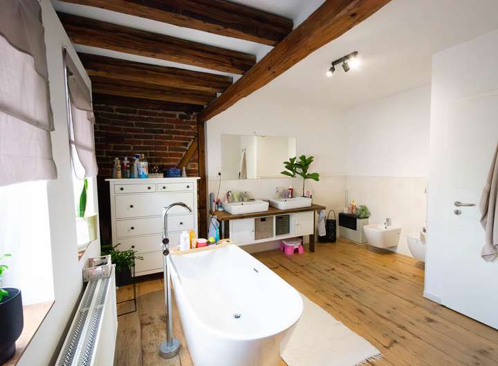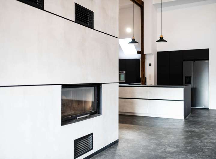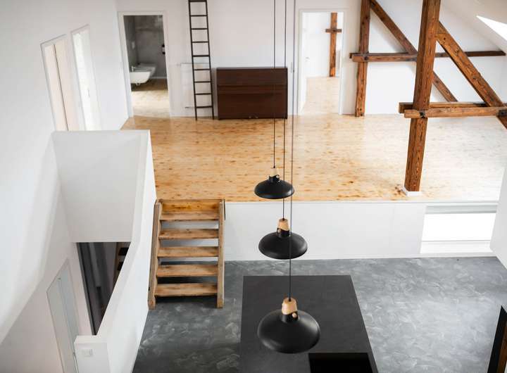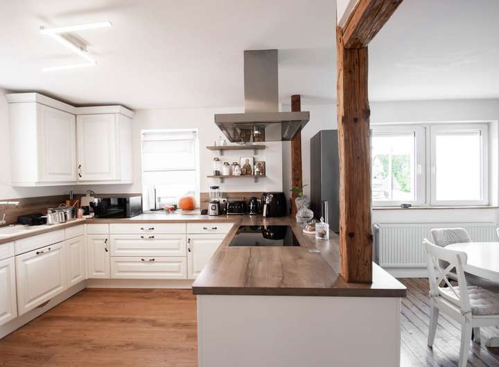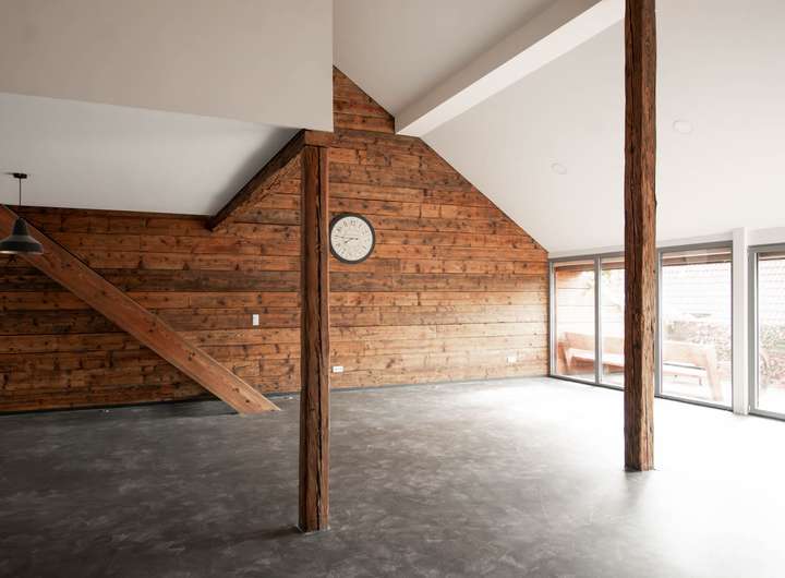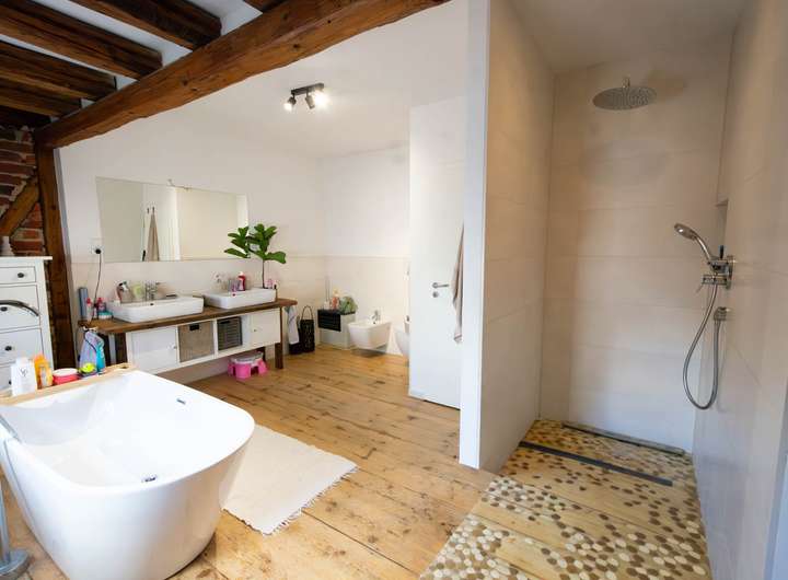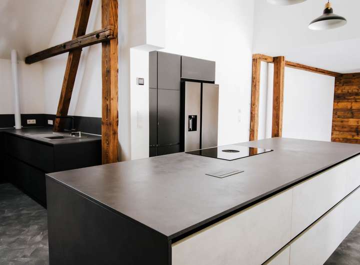 Ein absolutes Highlight ist die Loftwohnung in der ehemaligen Scheune mit ca. 250 m² Wohnfläche. Hohe Decken, großzügige Fensterflächen, sichtbare Holzbalken und offene Wohnbereiche verleihen ihr einen ganz besonderen Charakter. Auch in der Loftwohnung ist eine hochwertige Einbauküche integriert.