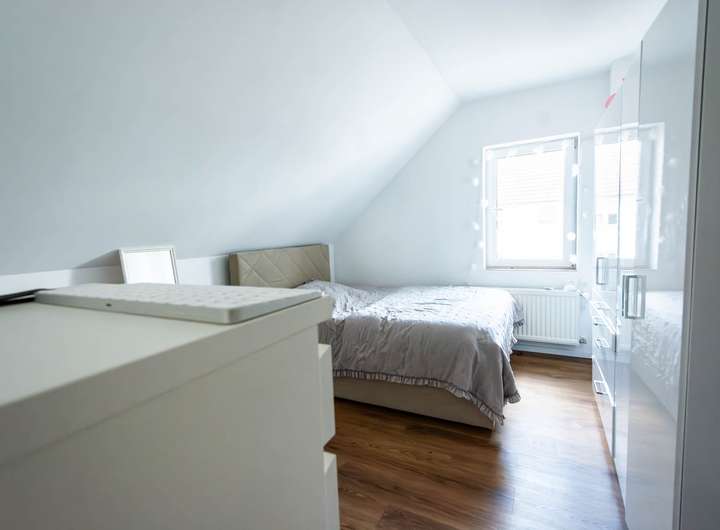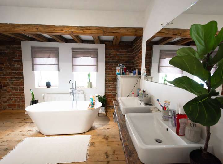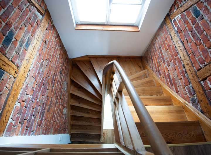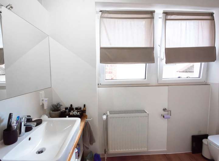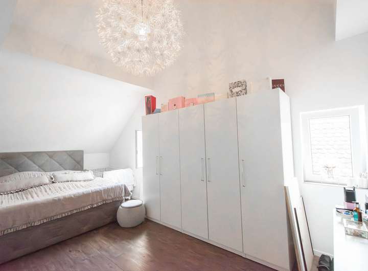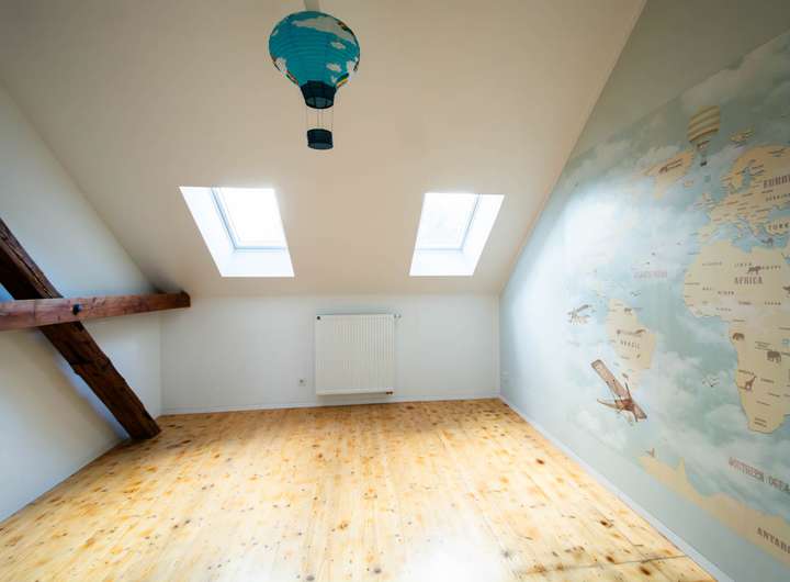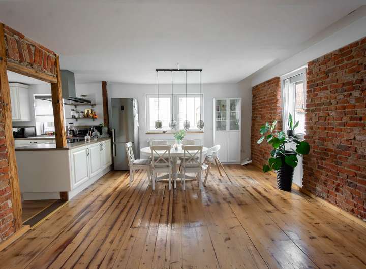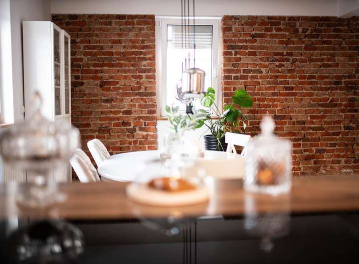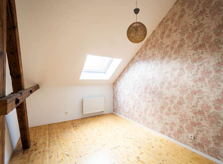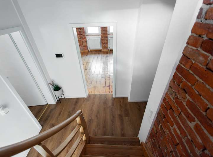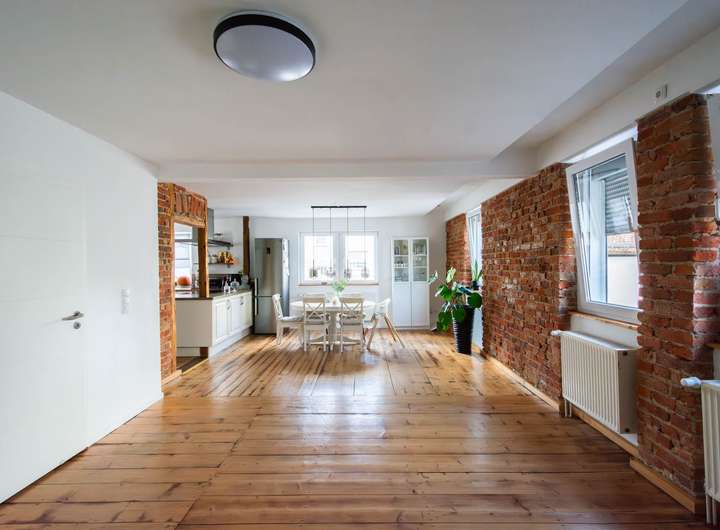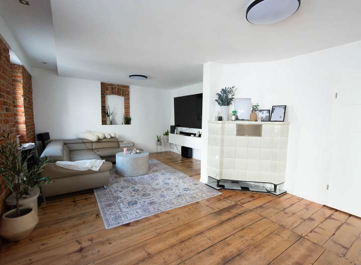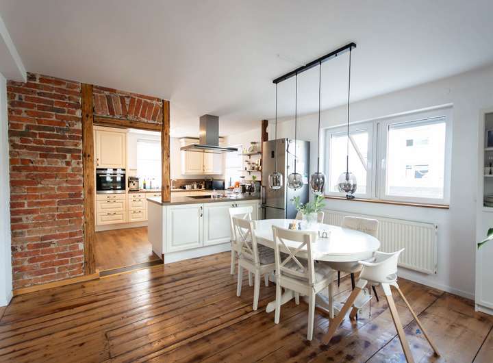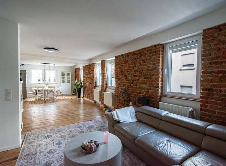 Das Vorderhaus wurde 2015 kernsaniert und bietet ein modernes Wohnambiente mit offen gestaltetem Wohn- und Essbereich, hochwertigen Bodenbelägen, einem stilvollen Badezimmer sowie vier großzügigen Schlafzimmern. Mehrere freigelegte Backsteinwände unterstreichen den industriell-rustikalen Charme und sorgen für ein stilvolles, atmosphärisches Wohngefühl. Die lichtdurchfluteten Räume und die durchdachte Raumaufteilung sorgen für ein angenehmes Wohngefühl.
