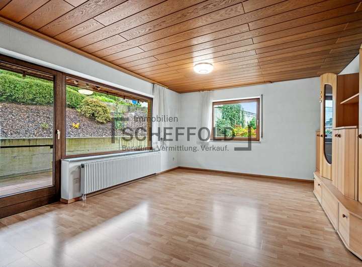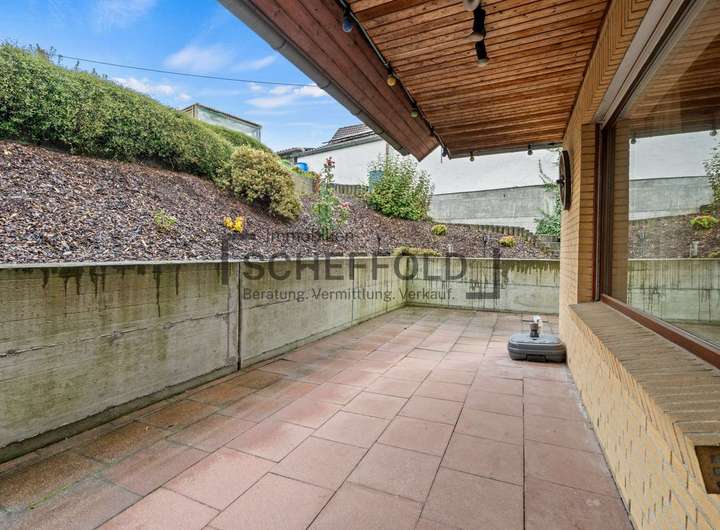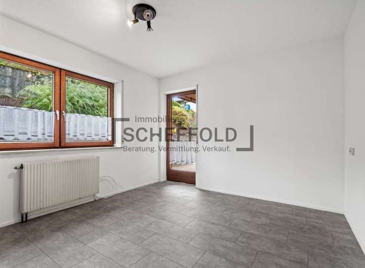 Sowohl von der Küche als auch vom Wohnzimmer aus gelangen Sie direkt auf die großzügige Terrasse und in den Garten, die einen herrlichen Blick ins Grüne bieten. Teilweise überdacht lädt die Terrasse zu entspannten Stunden im Freien ein – ob mit Familie, Freunden oder einfach für eine ruhige Auszeit vom Alltag.