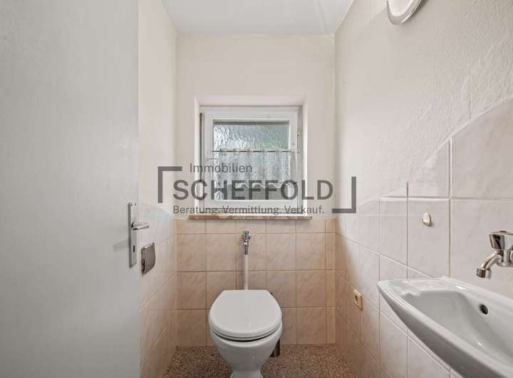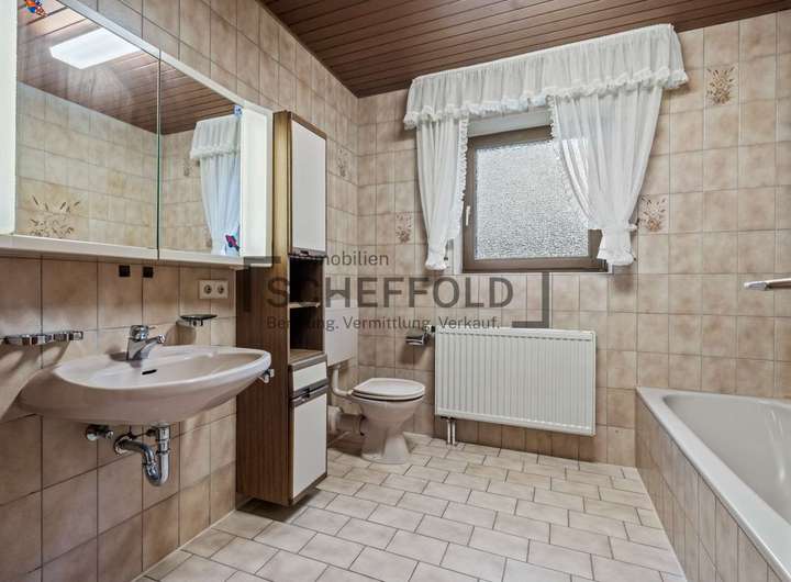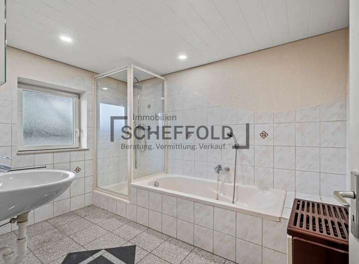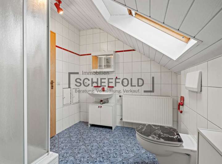 Darüber hinaus befinden sich auf dieser Etage ein helles Tageslichtbad sowie eine separate Toilette. Das Badezimmer ist mit einem Waschbecken, einer Toilette, einer Badewanne und einer Dusche ausgestattet und bietet damit allen Komfort für den Alltag.