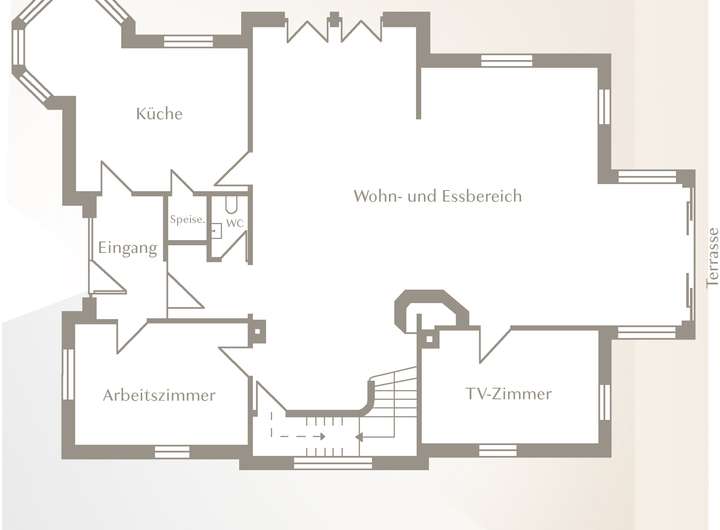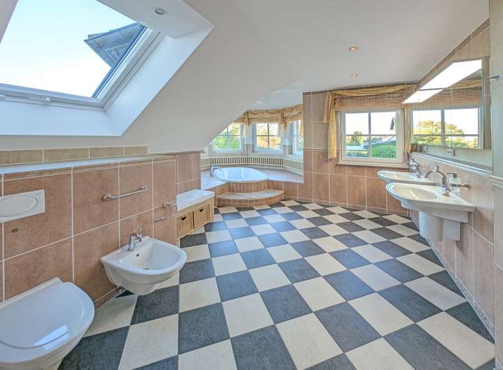 Das Erdgeschoss dieser repräsentativen Villa überzeugt mit einer großzügigen und durchdachten Raumaufteilung. Mittelpunkt ist der imposante Wohn- und Essbereich mit elegantem Kamin. Die helle Küche mit Kochinsel, Erker und praktischem Abstellraum bietet hohen Alltagskomfort. Ein separater TV-Raum und ein großzügiges Büro ergänzen das Raumangebot perfekt.