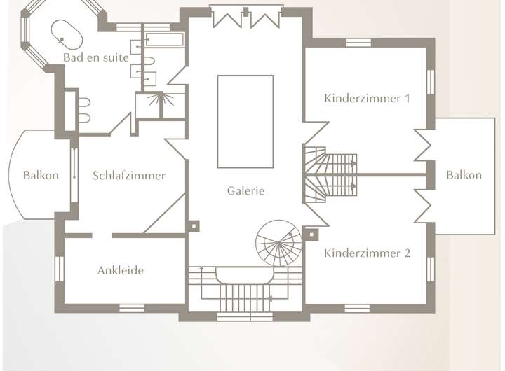 Im 1. Obergeschoss erwartet Sie eine Wohlfühletage für die ganze Familie. Eine offene Galerie verbindet die lichtdurchfluteten Räume. Zwei Kinderzimmer mit Zugang zum gemeinsamen Balkon verfügen jeweils über einen eigenen Aufgang zu einer zusätzlichen Fläche im Dachgeschoss. Ein Tageslichtbad mit Wanne und Dusche komplettiert diesen Bereich. Das Elternschlafzimmer präsentiert sich als privater Rückzugsort mit Ankleide und luxuriösem Bad en Suite.