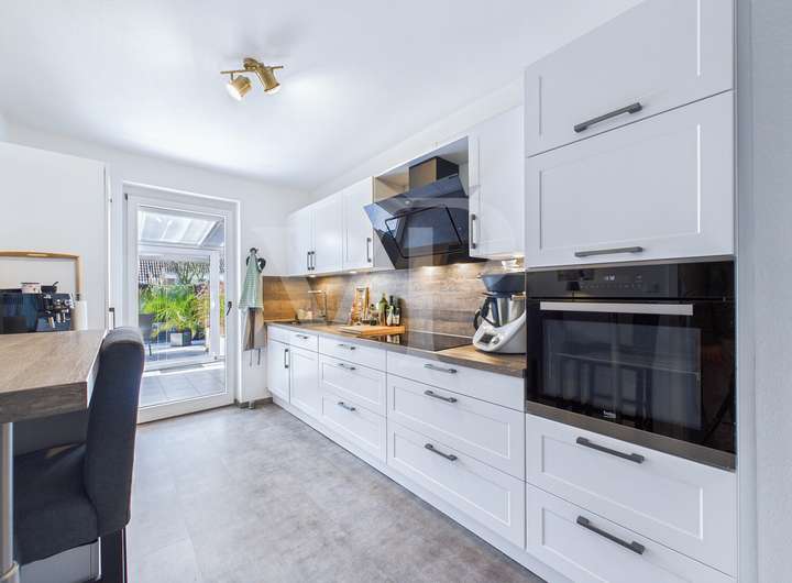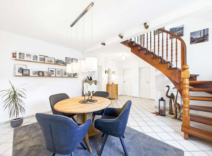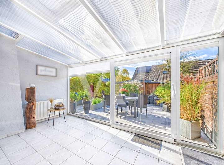 Die vier Wohn- und Schlafzimmer verteilen sich auf zwei Ebenen, was flexible Nutzungsmöglichkeiten schafft. Im Erdgeschoss befindet sich der offen gestaltete Wohn- und Essbereich mit direktem Zugang zum Wintergarten (erbaut 1992). Dieser lichtdurchflutete Raum erweitert das Wohnangebot und eignet sich hervorragend für gesellige Stunden mit Familie und Freunden oder als Rückzugsort zum Lesen und Entspannen. Die Küche wurde funktional und modern ausgestattet und lässt keine Wünsche offen. Ergänzt wird das Erdgeschoss durch ein GästeWC, welches ebenfalls im Zuge der Modernisierung neu gestaltet wurde.