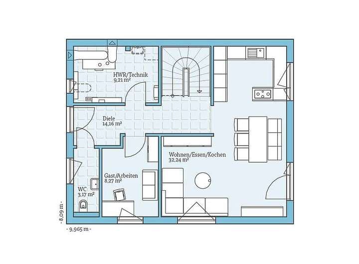 Im Erdgeschoss befinden sich der großzügige Wohn- und Essbereich mit offener Küche, Technikraum, Gäste-WC sowie ein Zimmer welches als Gäste- oder Arbeitszimmer genutzt werden kann.