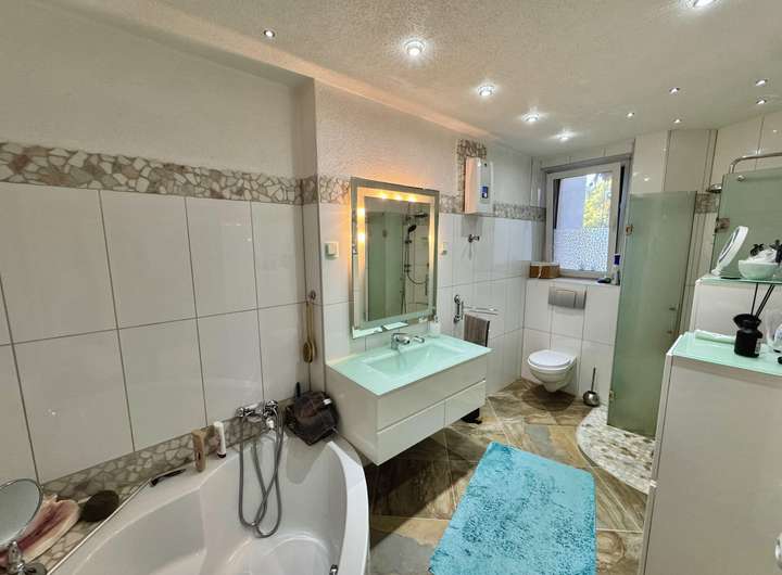 Das stilvolle Tageslichtbad ist mit einer bodentiefen Dusche, Eckbadewanne und einer individuellen Beleuchtung ausgestattet und bietet hohen Komfort. Ein separates Gäste-WC ergänzt die Ausstattung.