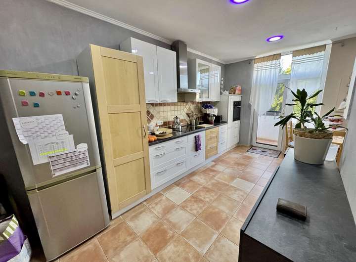 Die Küche ist besonders geräumig, bietet Platz für einen kleinen Essbereich und hat direkten Zugang zum großen Balkon mit herrlichem Blick in die Gartenanlagen. Der zweite, kleinere Balkon verfügt über einen elektrischen Flaschenzug, der durch die Eigentümergemeinschaft genehmigt wurde – ideal zum Transport von Brennholz oder Einkäufen.