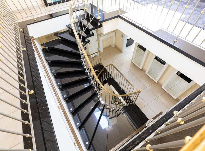 Die Empfangshalle mit offenem Treppenhaus und freitragenden Treppe mit Granitstufen lässt schon