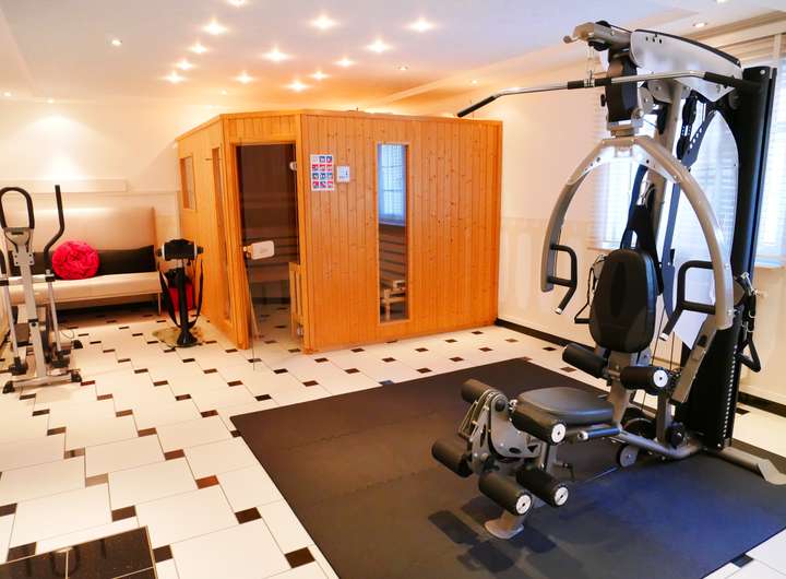 Fitnessbereich mit weiterem Badezimmer mit Dampfbad und Sauna.