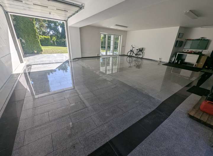 Die Garage ist gefliest und verfügt durch die zwei elektrischen Segmenttore auch die Möglichkeit, dank der