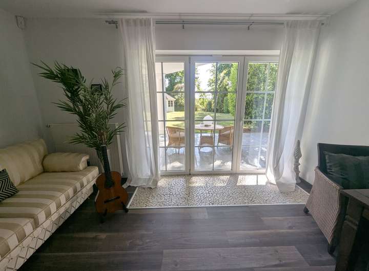 In der Hauptwohnung befinden sich im Erdgeschoß die Küche, das große helle und offene Wohn- und Esszimmer mit Kamin, sowie das