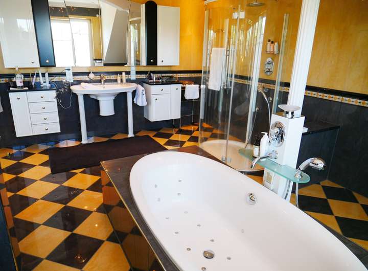 Die großen hochwertigen Fliesen im ganzen Haus und die modernen und exklusiven Ausstattung in Bädern