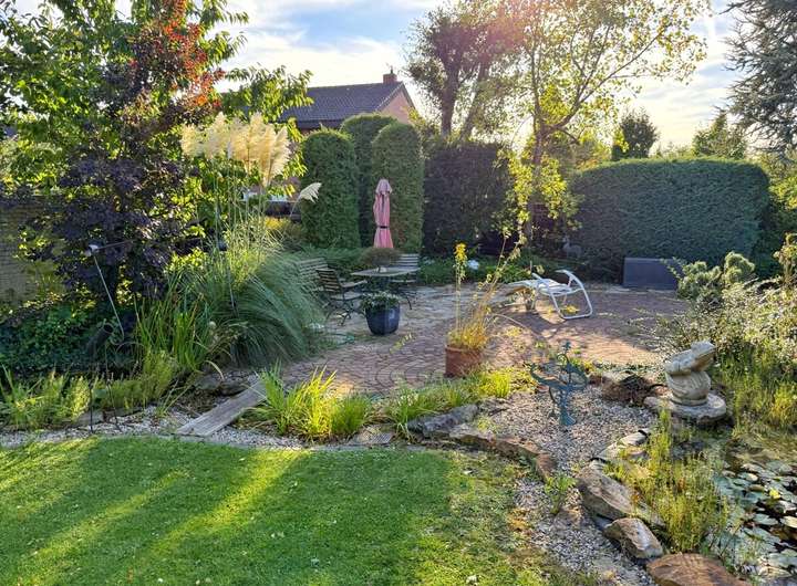 - hochwertige Gartengestaltung mit u. a. Teich-/Bachanlage