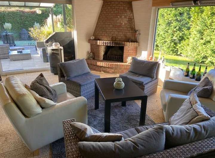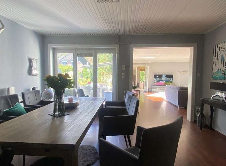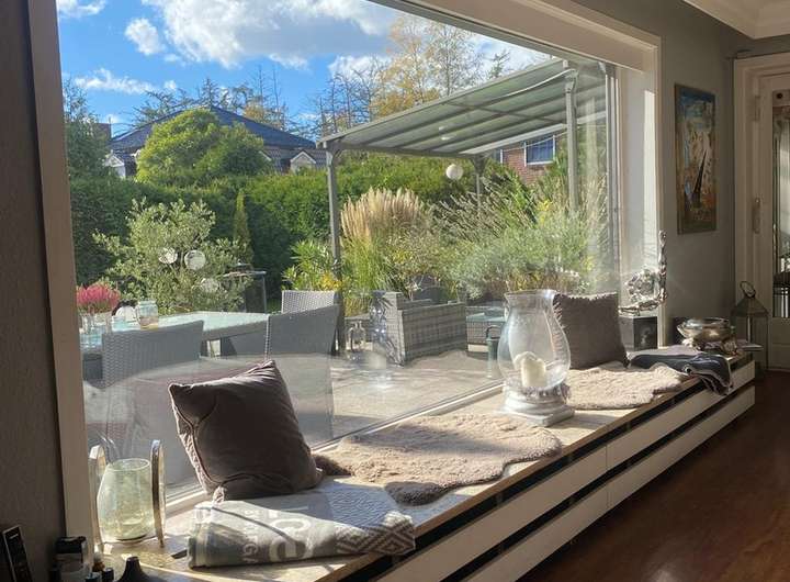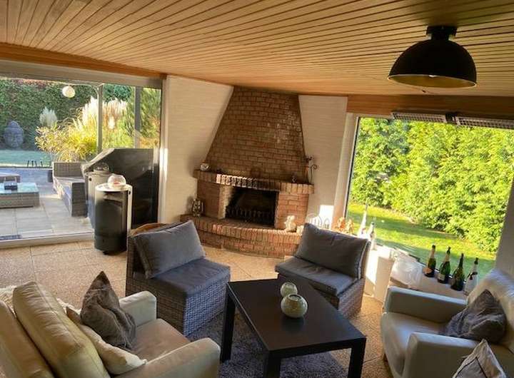 Ein großer, heller Wohn- und Essbereich mit Kamin sorgt für eine gemütliche Atmosphäre. Der angrenzende Wintergarten - ebenfalls mit Kamin - lädt zum Entspannen ein und bietet einen schönen Blick in den Garten. Von hier und vom Esszimmer aus gelangt man auf die sonnige Terrasse mit Süd-West-Ausrichtung.