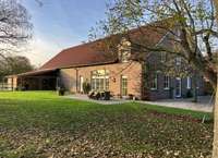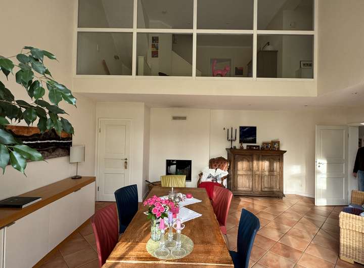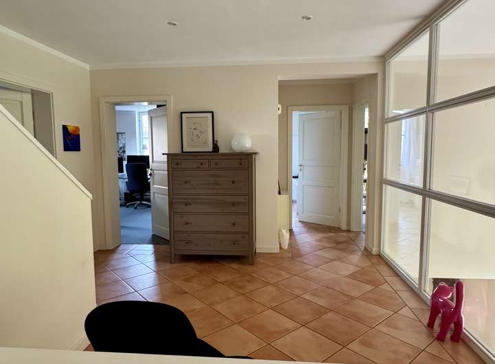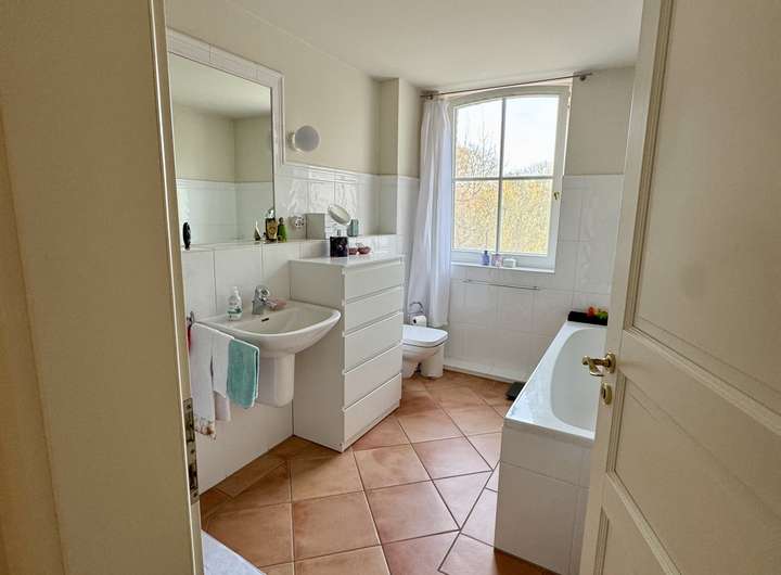 Der Landhauscharakter wird wirkungsvoll durch die im gesamten Erdgeschoss vorhandenen Terracottafliesen unterstrichen. In den Obergeschossen befinden sich vier Schlafzimmer und zwei Bäder, die jeweils mit Dusche und Badewanne ausgestattet sind. Das Haus verfügt außerdem über einen Glasfaseranschluss.