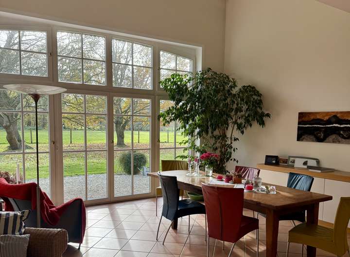 Sechs gut geschnittene Räume dieses freistehenden Hauses sorgen für genügend Platz zum Entfalten und Wohlfühlen. Im Erdgeschoss befindet sich der repräsentative Wohnbereich mit offenem Kamin und Galerie, sowie die angrenzende Küche und ein Esszimmer. Durch einen doppelflügeligen Austritt erreicht man die Terrasse und eine zweite überdachte Terrasse mit Blick in die unverbaute, freie Natur über Wiesen und Wälder.