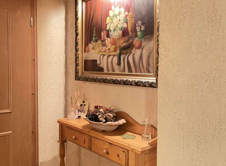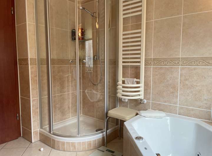 Auf dieser Etage befinden sich zudem die Küche mit funktionalen Elektrogeräten, ein Gäste-WC sowie drei großzügig geschnittene Schlafzimmer. Eines der Schlafzimmer verfügt über ein eingebautes Waschbecken, was äußerst praktisch ist. Das Badezimmer ist mit einer Wellness-Whirlwanne, einer Dusche und einem Bidet ausgestattet, sodass Sie hier optimale Entspannung genießen können.