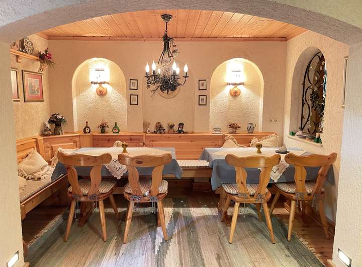 Die Wohnfläche erstreckt sich über eine großzügige Hauptebene, die einen offenen Wohn- und Essbereich mit Kaminofen umfasst. Von dort aus gelangen Sie auf eine große Terrasse mit traumhaftem Blick in den liebevoll gestalteten Garten – ideal für entspannte Stunden und gesellige Grillabende.