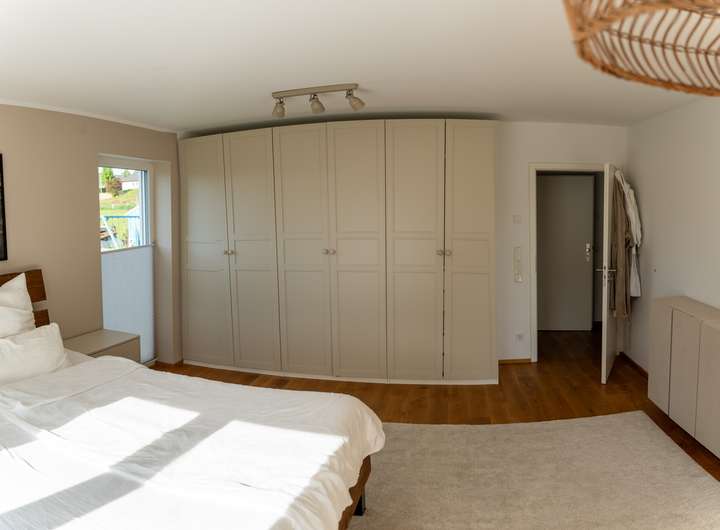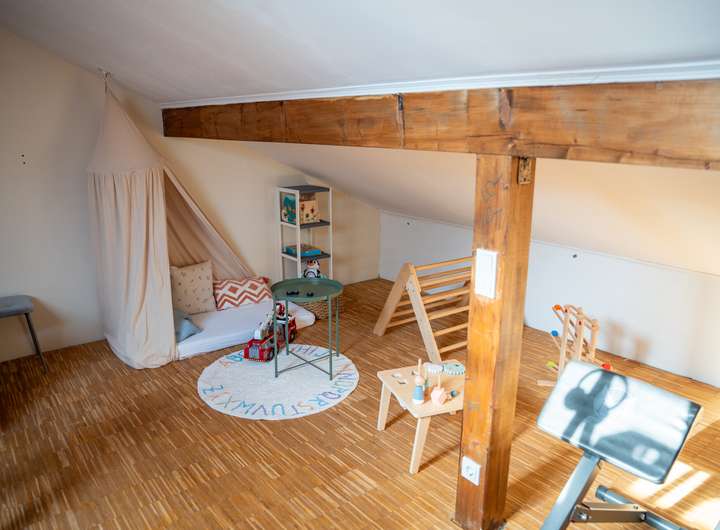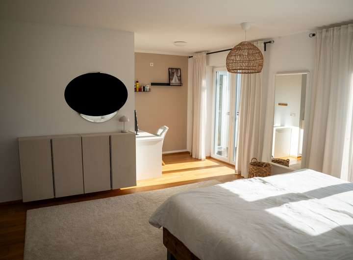 Im Obergeschoss liegen mehrere gemütliche Schlafzimmer sowie ein weiteres, großzügiges Bad mit Badewanne, bodentiefer Dusche und Fenster. Das Dachstudio auf der dritten Ebene bietet vielseitige Nutzungsmöglichkeiten – ob als Arbeitszimmer, Gäste- oder Hobbyraum.