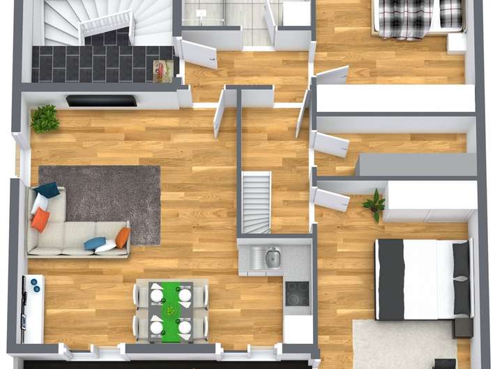 Im Erdgeschoss erwartet Sie ein großzügiger Wohn- und Essbereich mit einer hochwertigen Einbauküche, die Funktionalität und Design perfekt vereint. Es besteht die Möglichkeit ein drittes Zimmer im Erdgeschoss zu errichten, um weitere Privatsphäre oder ein Kinderzimmer zu erhalten. Darum kümmert sich gern der Vermieter. Wie das dann aussehen würde, können Sie dem Grundriss entnehmen. Ebenfalls auf dieser Ebene befindet sich ein modernes Duschbad mit Fenster, das Komfort und Praktikabilität im Alltag bietet.