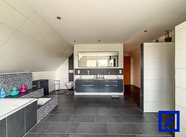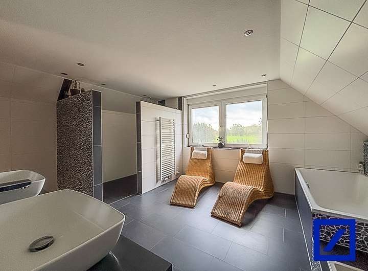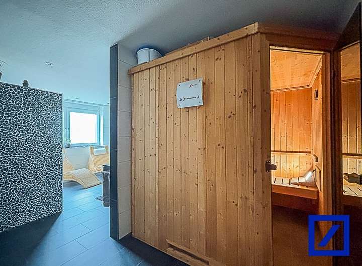 Das sehr große Badezimmer ist eine wahre Wellness-Oase: Ausgestattet mit einer großen Familiendusche, einer Badewanne, einem Bidet und einer Sauna, bietet es alles, was das Herz begehrt. Das Besondere: Durch das Fenster genießen Sie beim Entspannen einen direkten Blick ins Grüne.