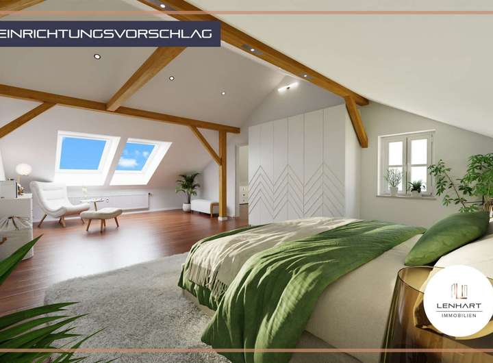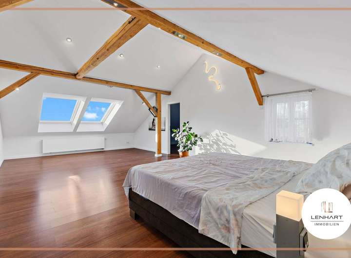 Im Dachgeschoss erwarten Sie ein großes Badezimmer mit Doppelwaschbecken, Whirlpool und begehbarer Dusche, die auch als Infrarotkabine dient. Das komfortable Elternschlafzimmer bietet eine separate Ankleide. Durch die Sichtbalken erhält der Raum eine gemütliche, einladende Atmosphäre. Außerdem ist ein geräumiges Kinderzimmer vorhanden, das flexibel eingerichtet werden kann. Zwei Abstellräume dienen als Lagerflächen.
