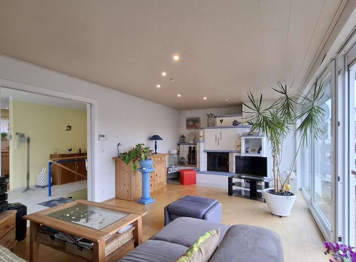 Der lichtdurchflutete Wohnbereich mit bodentiefen Fenstern, inkl. elektrischer Rollläden, öffnet den Blick weit ins Grüne und schafft eine Atmosphäre von Großzügigkeit und Geborgenheit. Der gemütliche Kamin sorgt an kühleren Tagen für eine warme, behagliche Stimmung – ein Ort, an dem man gerne verweilt.