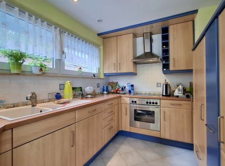 Die Küche ist zentral im Grundriss eingebunden und bietet einen direkten Zugang zum Wohnbereich, zur Terrasse und zum Flur – ideal für kurze Wege im Alltag. Insgesamt stehen drei Schlafzimmer zur Verfügung, die durch ihre Helligkeit und den Ausblick überzeugen.