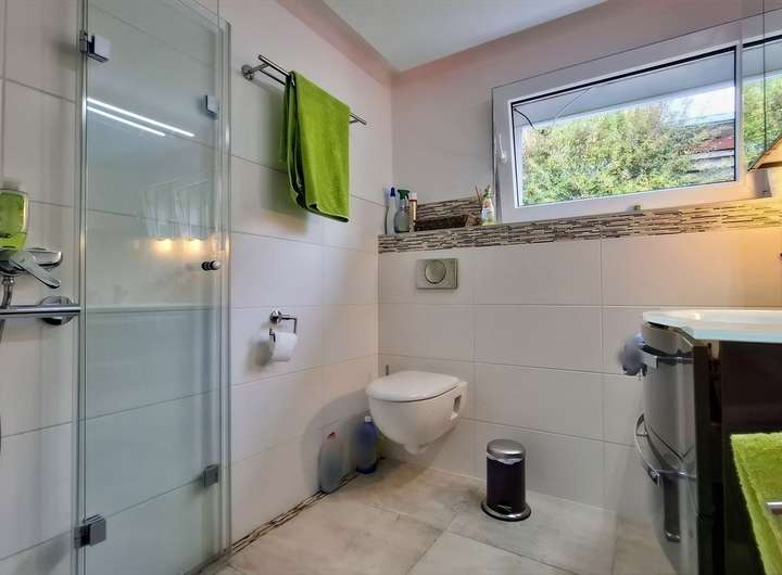 Das modernisierte Duschbad (2017) präsentiert sich mit Fußbodenheizung angenehm komfortabel und zeitgemäß. Ein zusätzliches Gäste-WC im Souterrain steht bereit und bietet Potenzial zur individuellen Modernisierung.