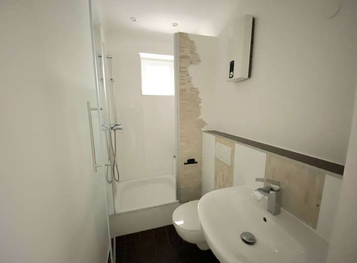 Das Tageslichtbadezimmer verfügt über eine Dusche. Die Ausstattung und die Spotlights in der Decke sorgen für ein modernes Ambiente und runden das Gesamtbild der Wohnung ab. Hier lässt es sich nach einem langen Tag wunderbar entspannen.