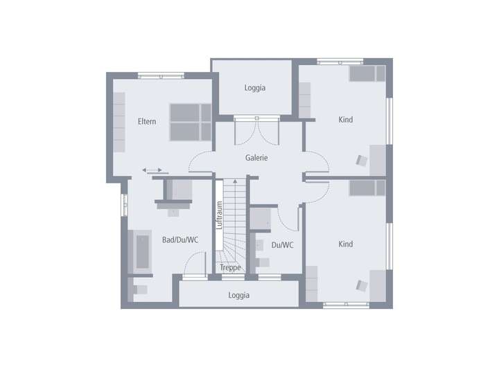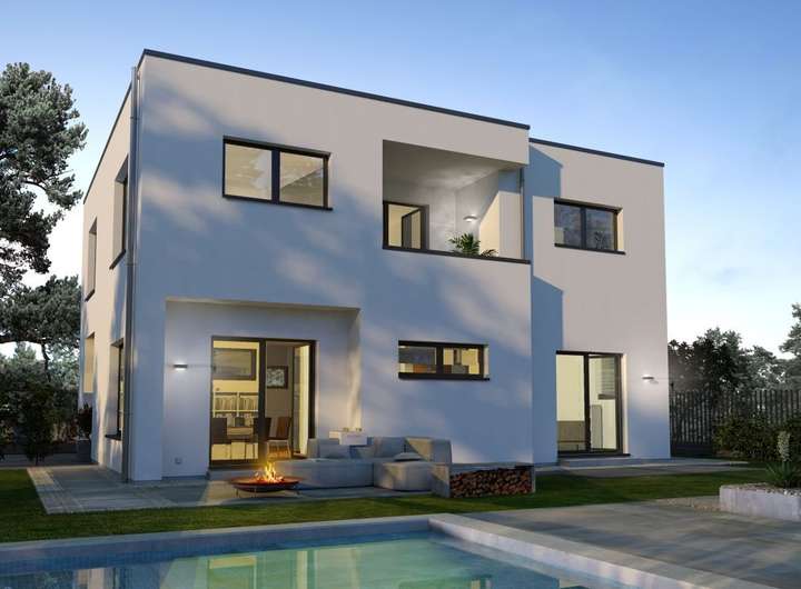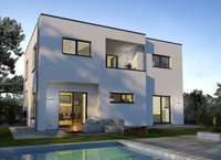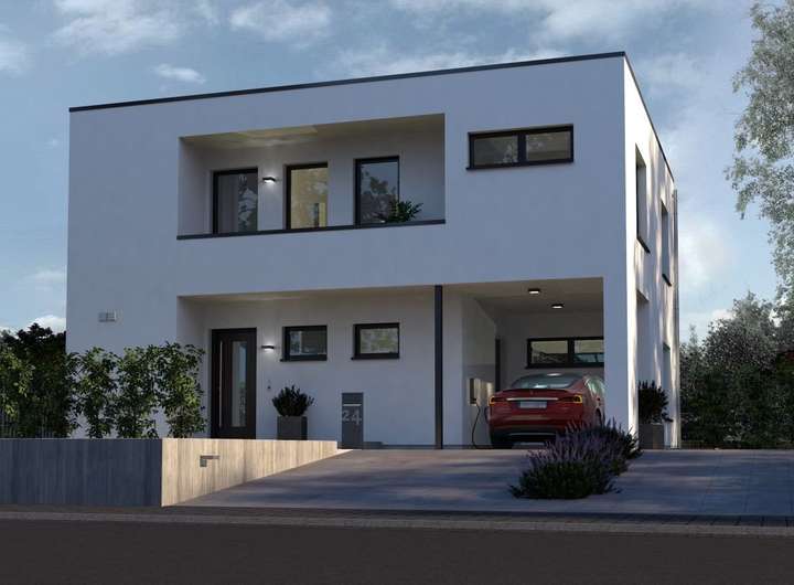 Die geradlinige Struktur der zweigeschossigen Flachdachvilla wird durch die Fassadenrücksprünge und die asymmetrische Gestaltung architektonisch ergänzt. Clever und vor allem für kleine Grundstücke geeignet: der integrierte Carport. Schlicht, hell und komfortabel geht es auch im Innenbereich weiter. Das Erdgeschoss ist klar in Nutz- sowie Wohn- und Essbereich mit offener Küche unterteilt. Die halbgewendelte Treppe führt in die obere Etage. Hier ist das Elternzimmer mit großem Bad und Zugang zur eigenen Loggia vom Areal der Kinder mit Dusche/WC abgegrenzt. Die Bereiche werden durch die lichte Galerie mit Zugang zu einer weiteren Loggia verbunden. Hier fühlt man sich zu Hause.