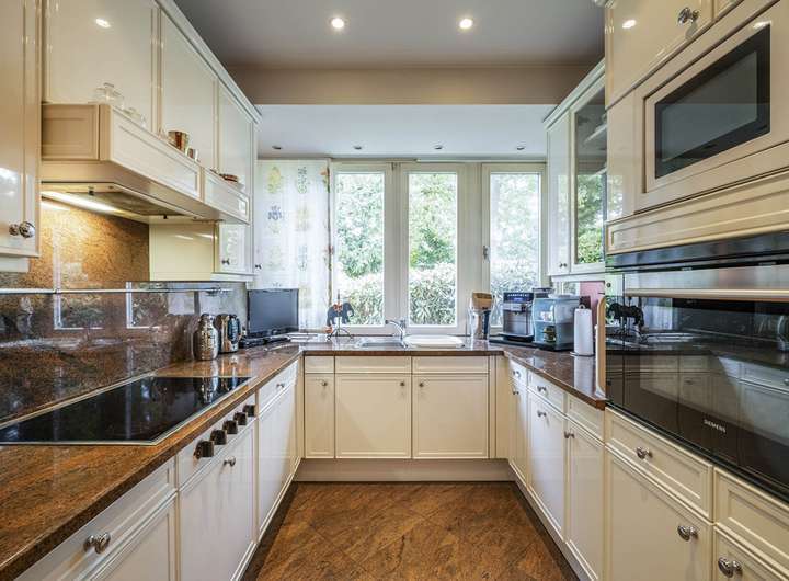 Damit bietet das Erdgeschoss den idealen Rahmen sowohl für festliche Anlässe als auch für den Alltag einer Familie. Besonders hervorzuheben ist die durchdachte Anordnung der Räume, die ein äußerst angenehmes Wohngefühl ermöglicht. Die helle Hochglanzküche mit Granitarbeitsplatte sowie funktional gestaltete Nebenräume sind komfortabel und hochwertig ausgestattet.