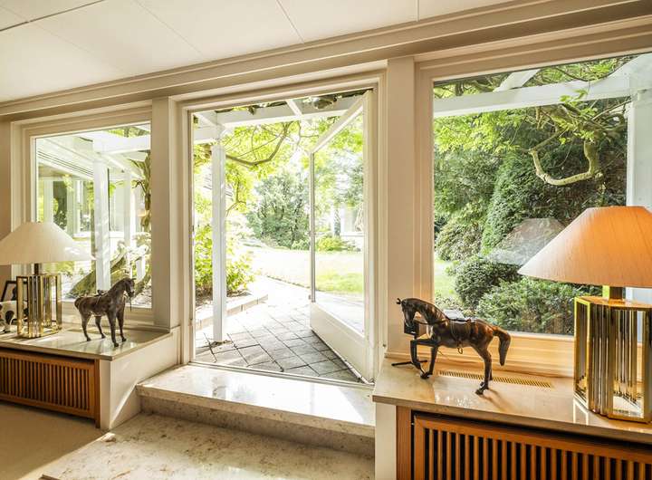 Großzügige Fensterflächen lassen viel Tageslicht einströmen und eröffnen zugleich einen beeindruckenden Ausblick – weitläufig, teilweise sogar mit Elbblick. Die Räumlichkeiten schaffen eine perfekte Kombination aus Helligkeit und Behaglichkeit – im Hauptraum sorgt ein offener Kamin für Atmosphäre, während im Anbau ein Schaukamin Akzente setzt.