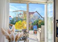 Hinter der Glastür befindet sich rechterhand eine praktische Nische, die als Garderobe genutzt wird. Die Einkäufe können Sie gleich gegenüber in der Küche abstellen. Hier ist viel Platz für ausgiebige Koch-Sessions oder auch den gemütlichen Morgenkaffee mit Blick aus der offenen Balkontür in das grüne Paradies. Auf der großen Terrasse mit Treppe in den Garten sind die frischen Kräuter direkt griffbereit.