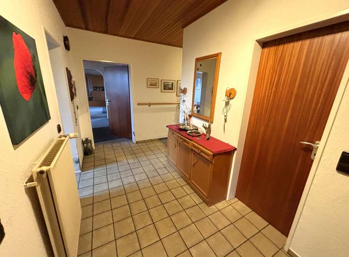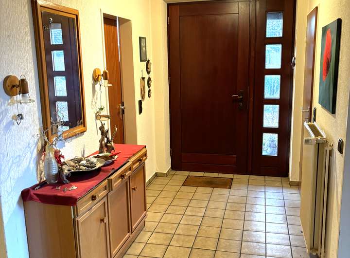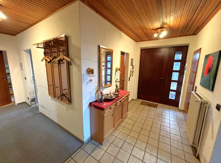Über den überdachten Eingansbereich gelangen Sie in den großzügigen, gefliesten, zentral angelegten Flur, von dem aus alle Räumlichkeiten abgehen.