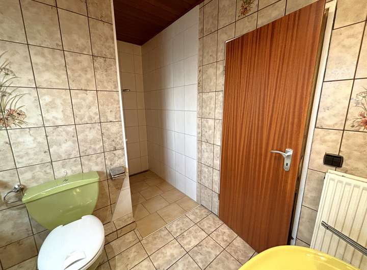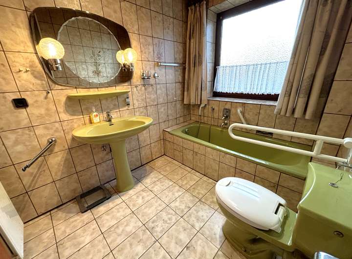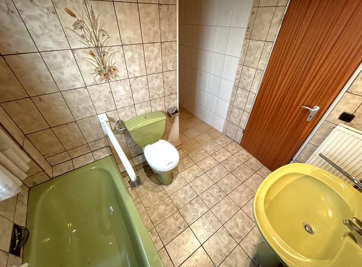 Das Badezimmer als gefliestes Voll- und Duschbad mit Fenster präsentiert sich noch in der ursprünglichen Ausstattung mit grünen Objekten und vertäfelter Decke.