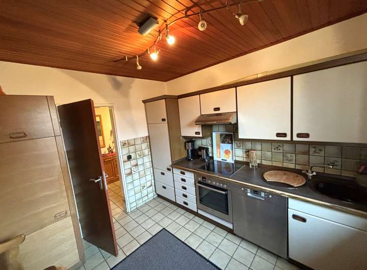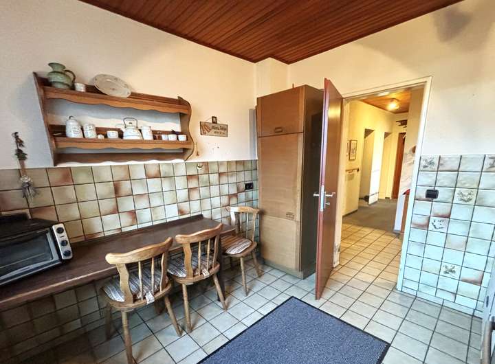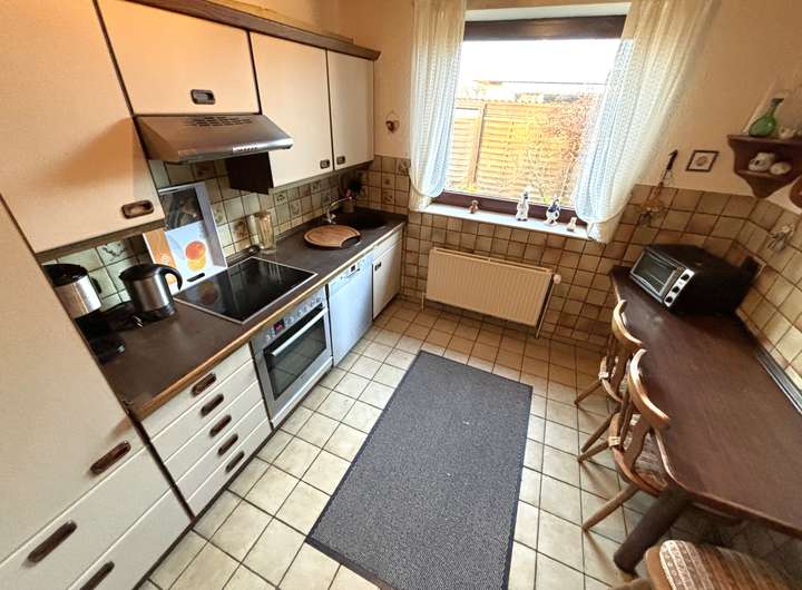 Die halbhoch geflieste Küche mit Fenster beinhaltet eine voll ausgestattete Einbauküche mit Sitzgelegenheit.