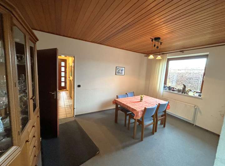 Das Esszimmer liegt direkt zwischen der Küche und dem Wohnzimmer, wobei das Esszimmer zum Wohnzimmer hin offen gestaltet wurde. Das großzügige, helle Wohnzimmer bietet den Zugang zur teilüberdachten, mit Spotlights versehenen Terrasse.